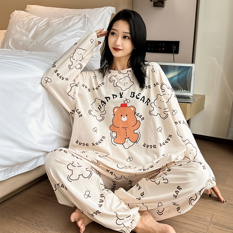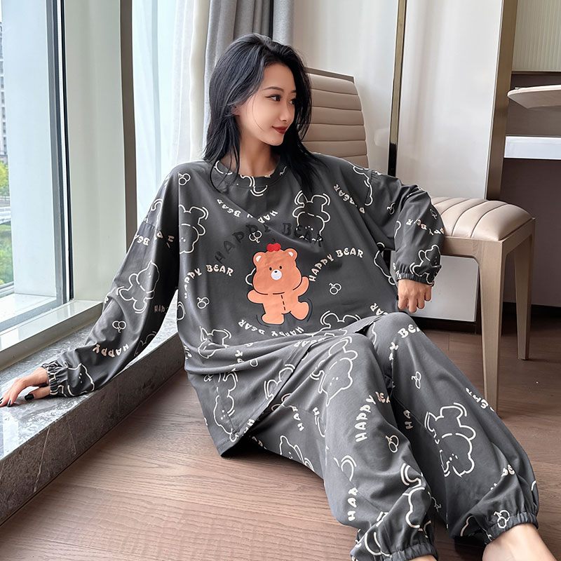 宽松圆领两件套家居服秋季 长裤 200斤胖mm春秋长袖 纯棉睡衣女大码