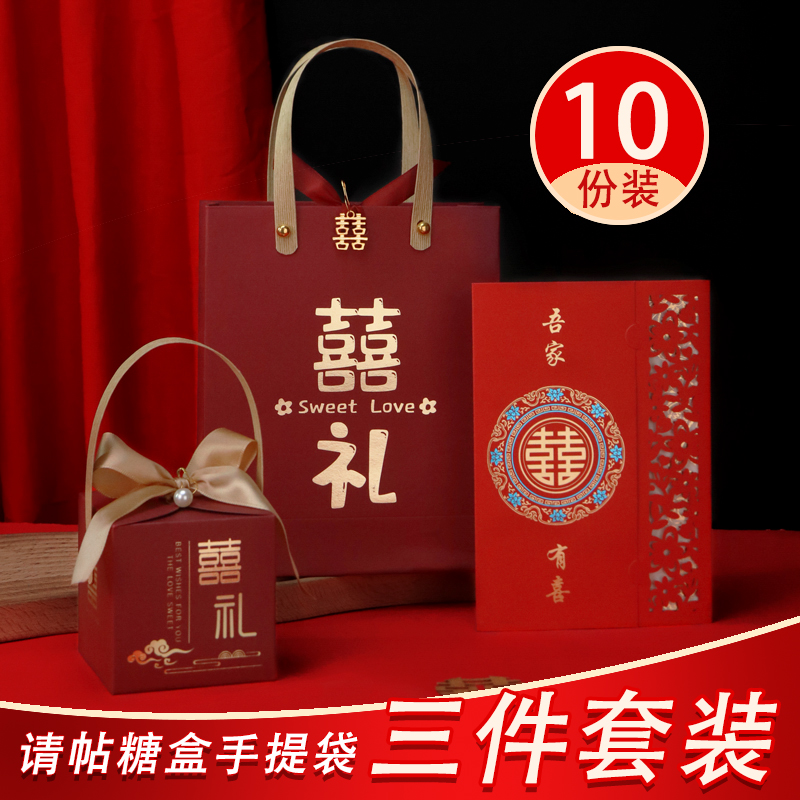 结婚喜糖盒请帖三件套2025新款 婚礼喜帖伴手礼请柬糖盒手提袋套装