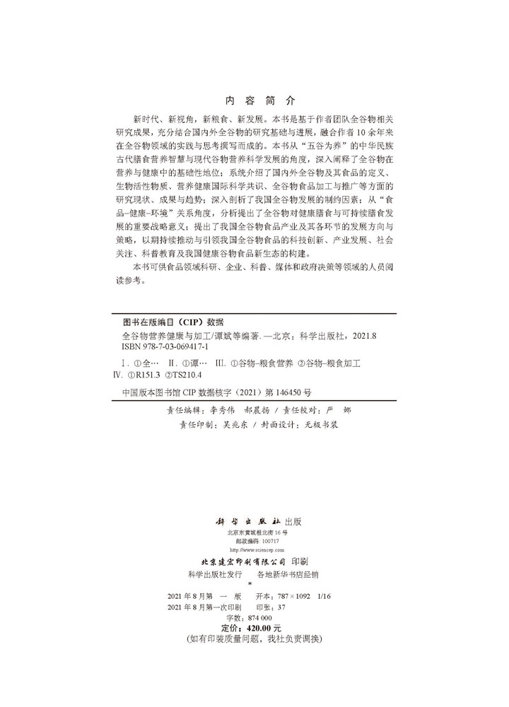 定义 社书籍KX 全谷物营养健康与加工 科学出版 全谷物标准及其发展方向 生物活性物质 国内外全谷物及其食品 等编著 谭斌 书