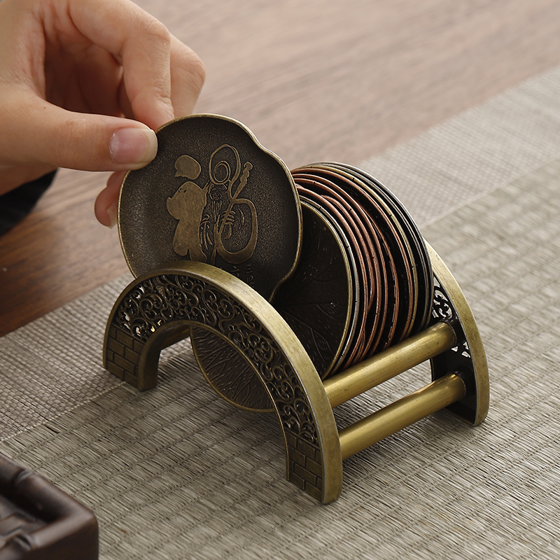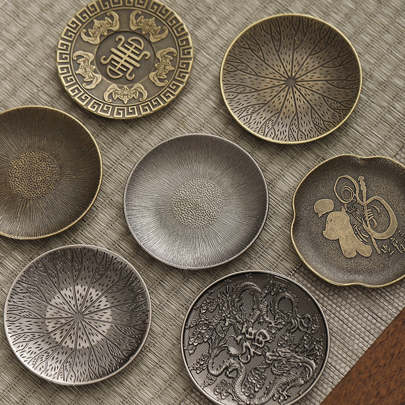 日式 仿古铜小杯垫合金隔热茶杯托做旧茶碟功夫茶具配件带收纳架子