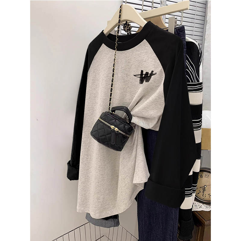 100%纯棉长袖 宽松遮肉显瘦套头外穿拼接薄卫衣B T恤上衣女秋冬韩版