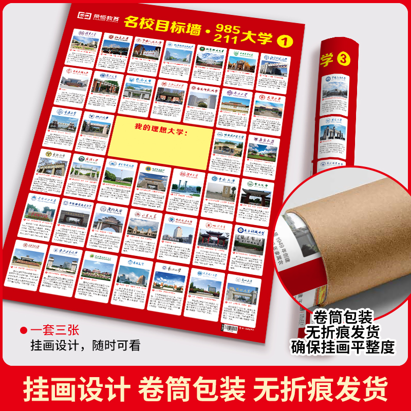 名校目标墙贴985 211小学高中高考大学目标贴纸报志愿学生激励榜荣恒大学介绍墙贴全套3张高考目标高中教室布置班级墙挂图墙贴高考