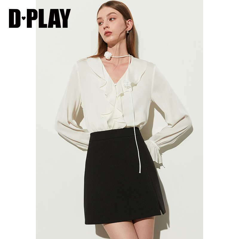 款 女装 法式 女上衣米白色衬衣别致缎面衬衫 v领衬衫 DPLAY早秋季