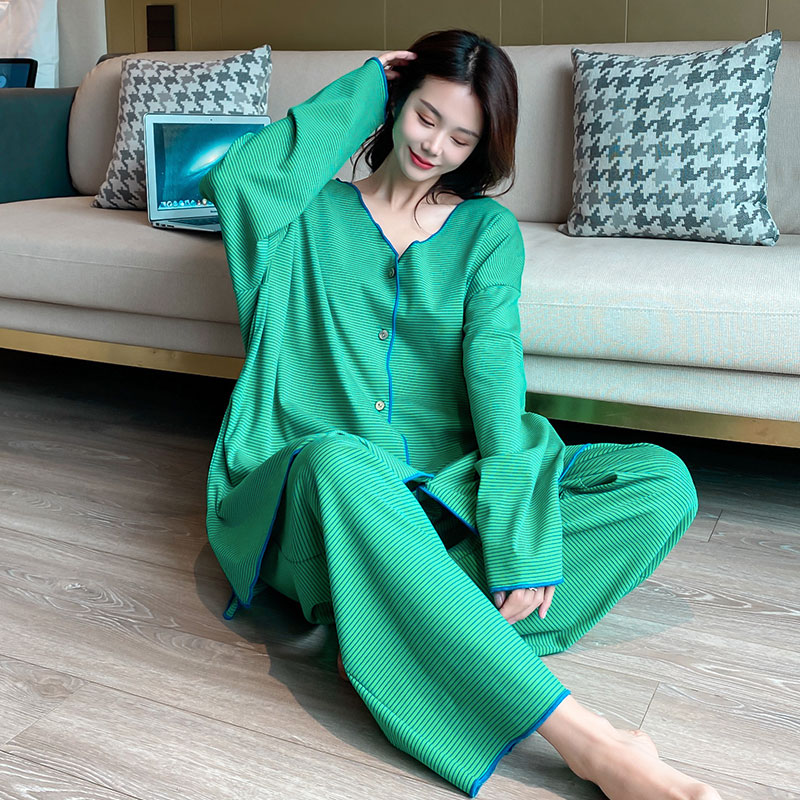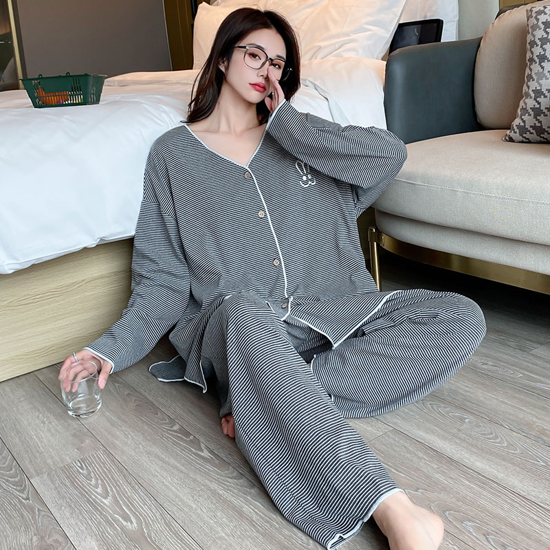 纯棉长袖 胖mmV领开衫 条纹宽松家居服两件套200斤 大码 春秋睡衣女款