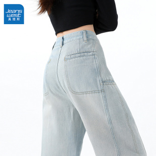 潮牌宽松阔腿直筒休闲长裤 男女新款 子 复古简约白色弯刀牛仔裤 美式