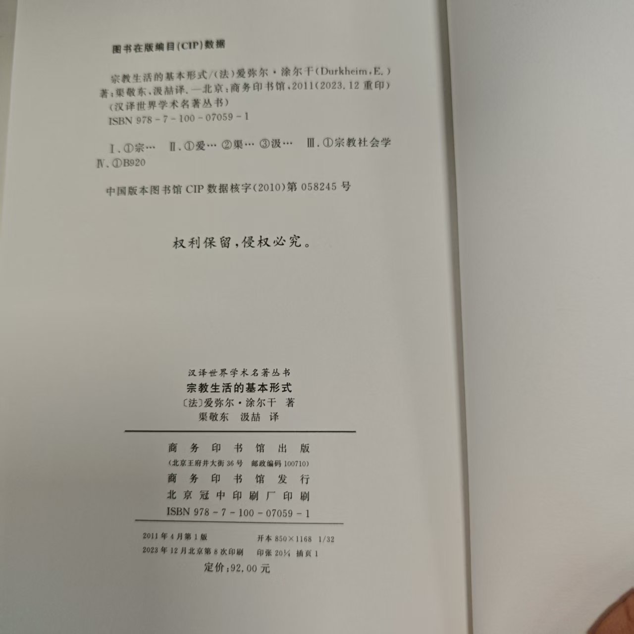 宗教生活 9787100070591 基本形式 爱弥尔·涂尔干 商务印书馆 法 微瑕