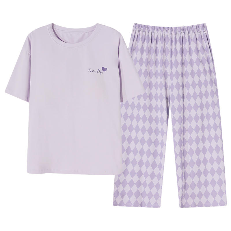 七分裤 纯棉夏天短袖 夏款 粉格家居服套装 猫人睡衣女款 2025新款 夏季