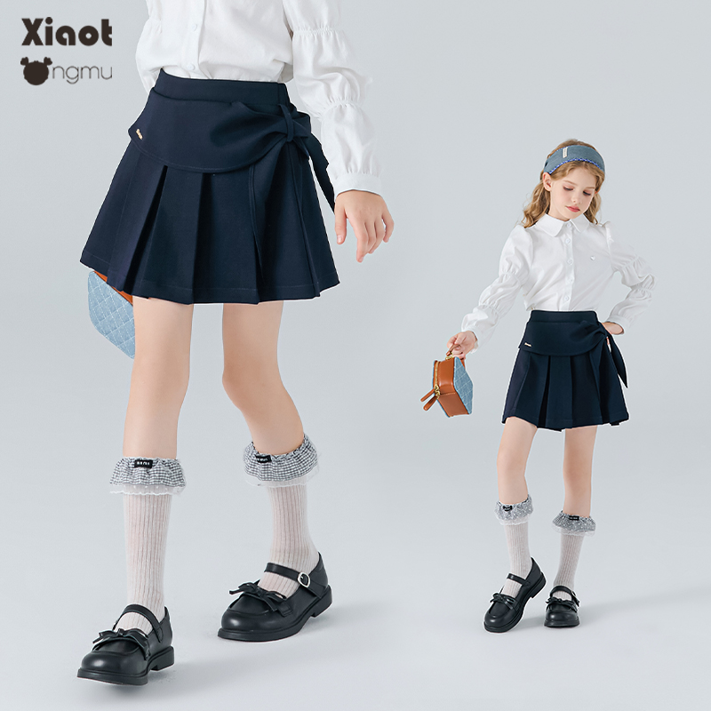 小童木 设计感蝴蝶结腰带女大童百褶裙 学院风女童半身裙2025新款