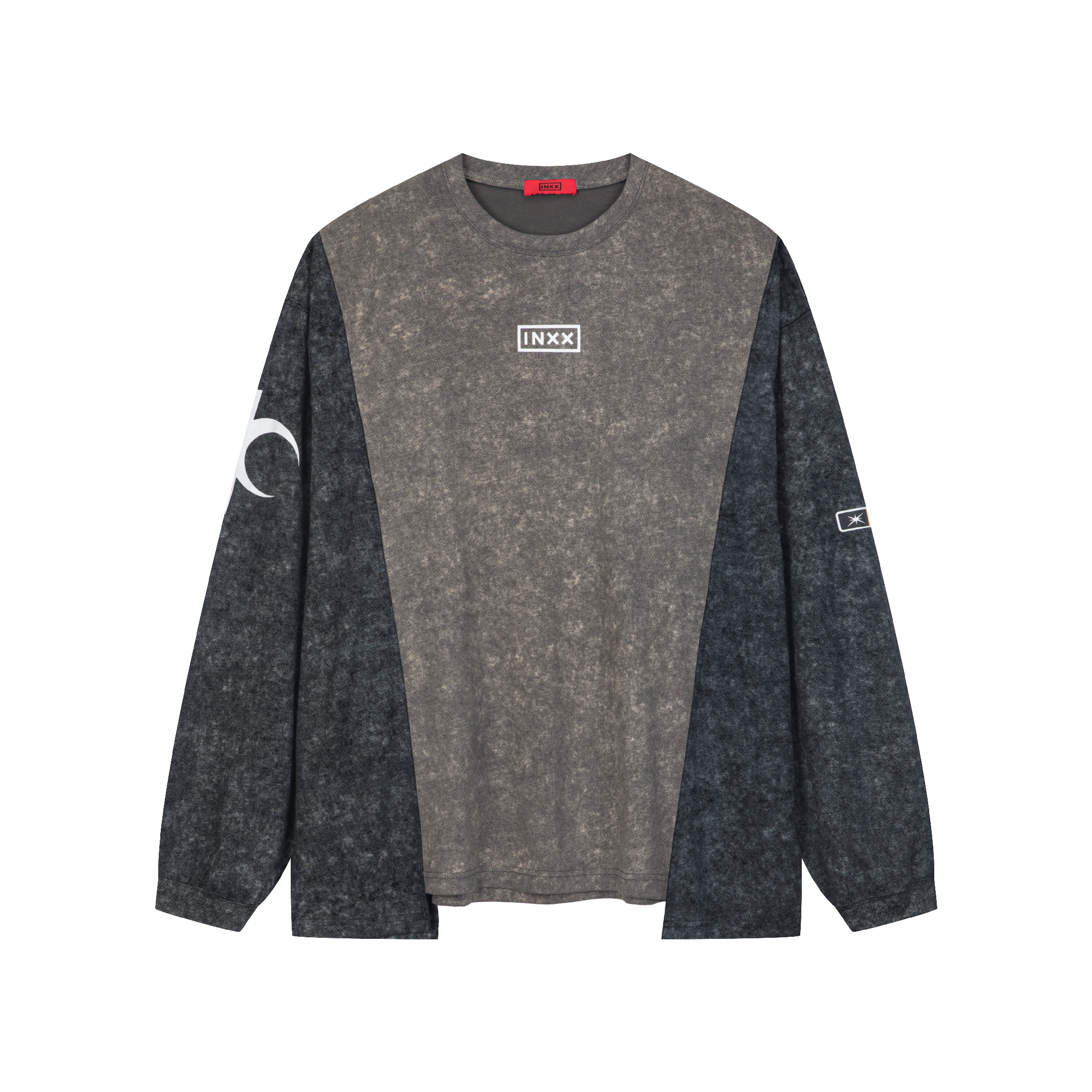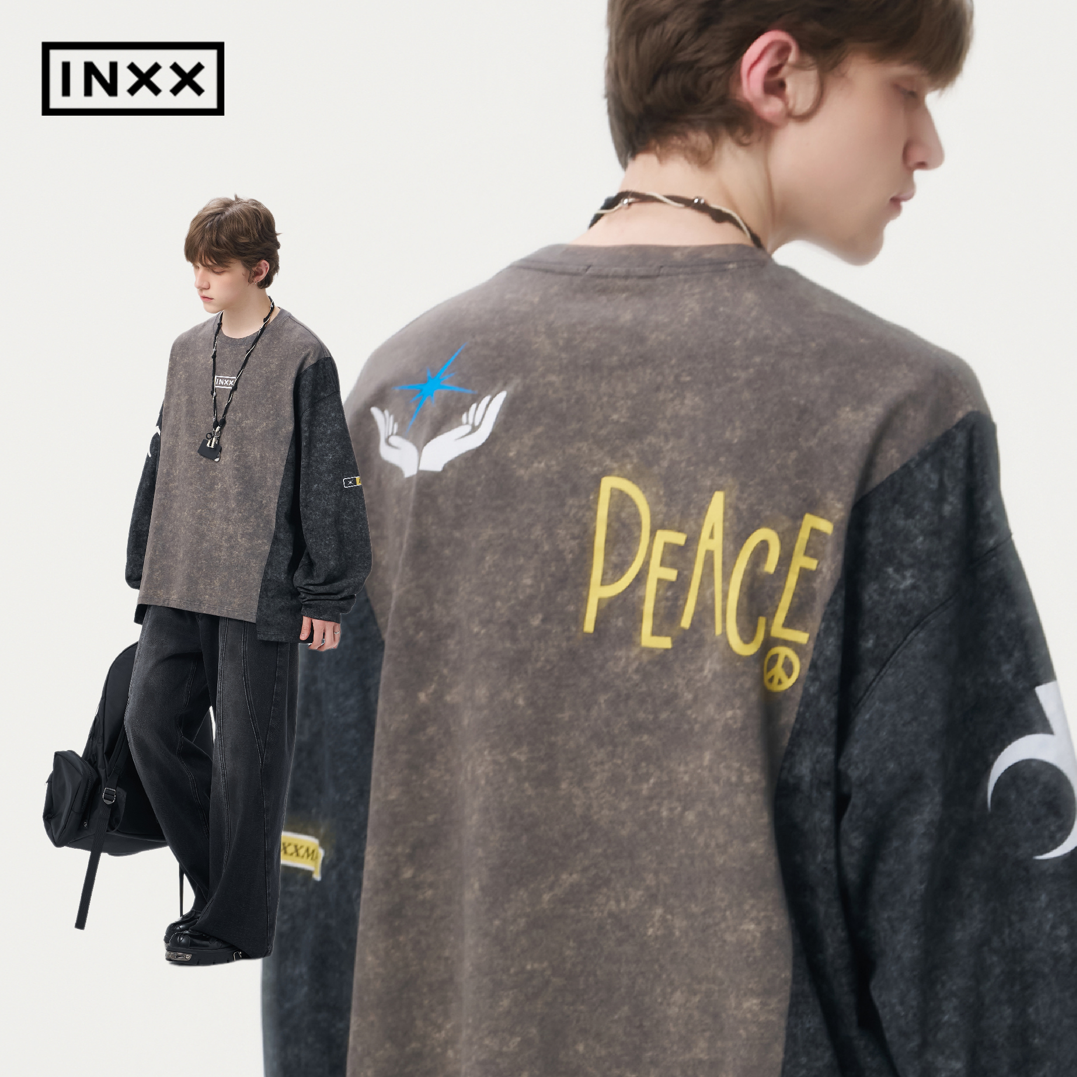 T恤男女同款 撞色拼接长袖 复古层次感印花圆领上衣打底衫 INXX