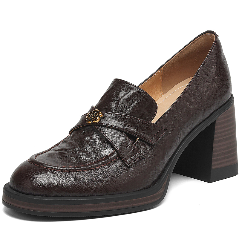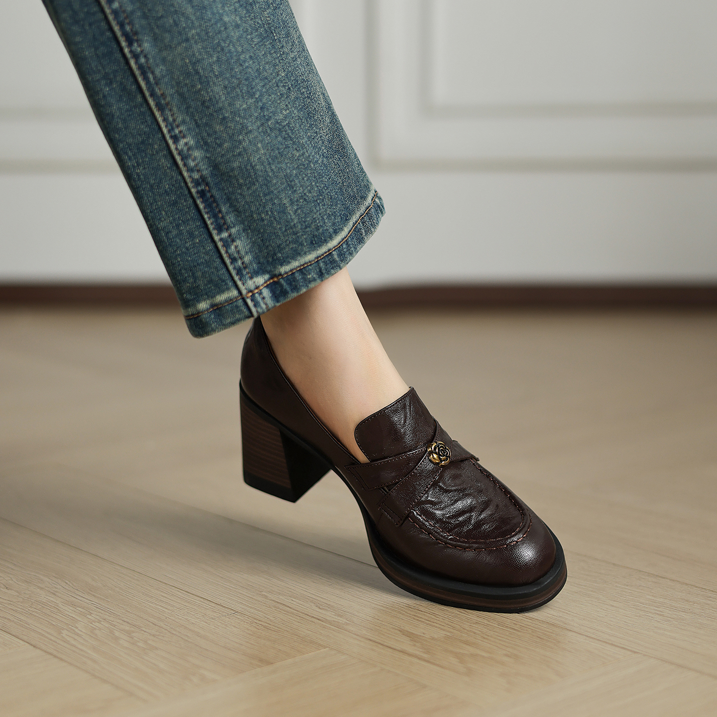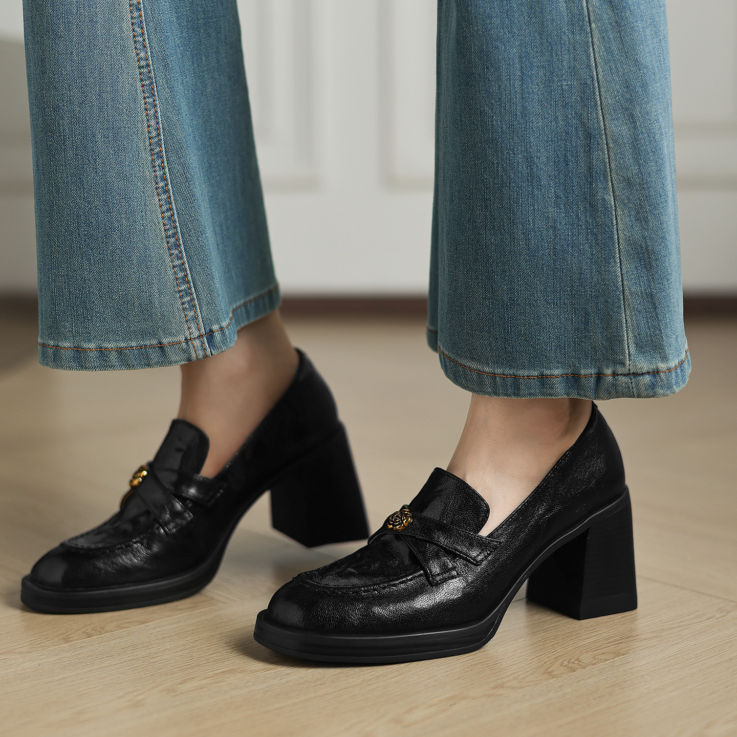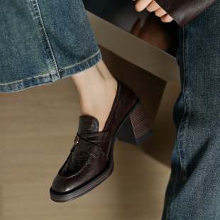 单鞋 浅口浅口高跟小皮鞋 女 女鞋 开怀依足头层羊皮粗跟英伦风乐福鞋