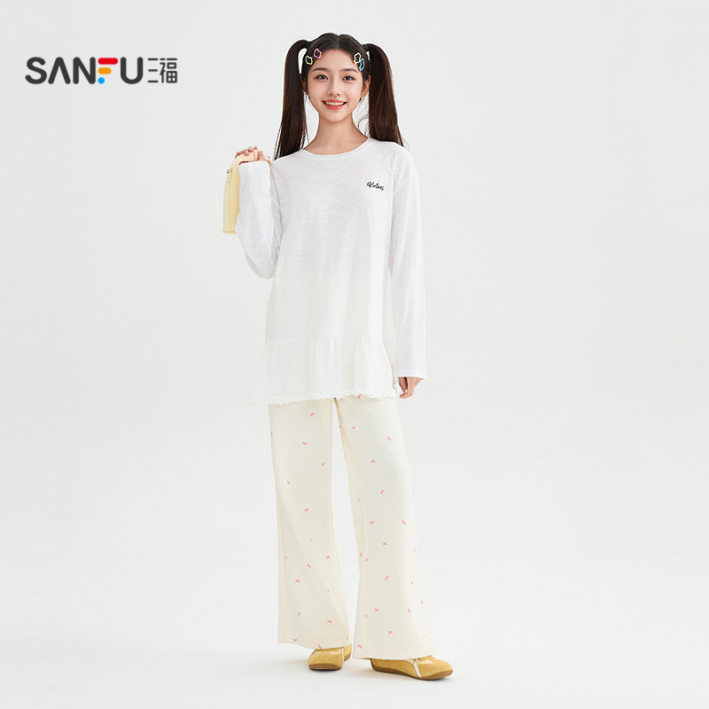 上衣女装 三福长袖 花边摆宽松休闲中长款 秋季 507603 T恤女2025新款