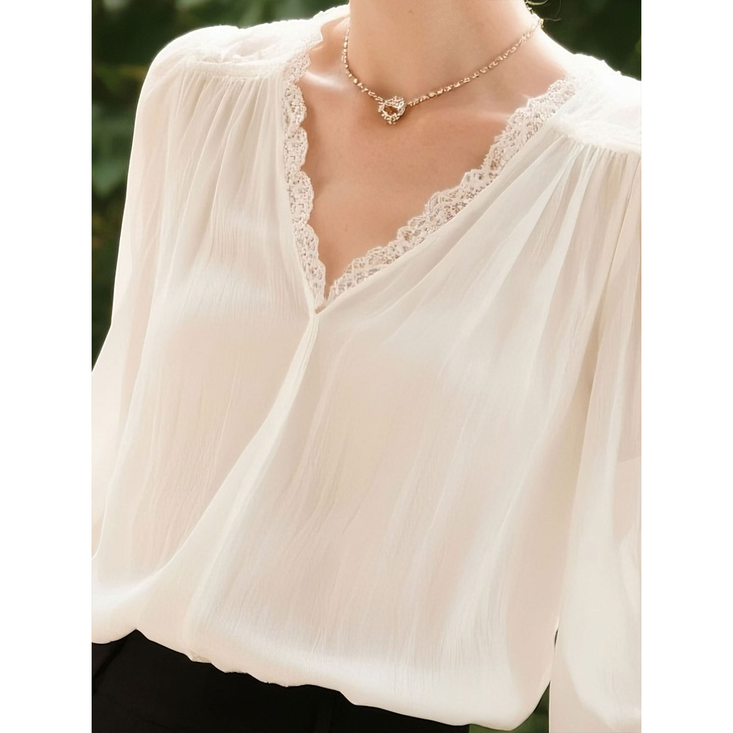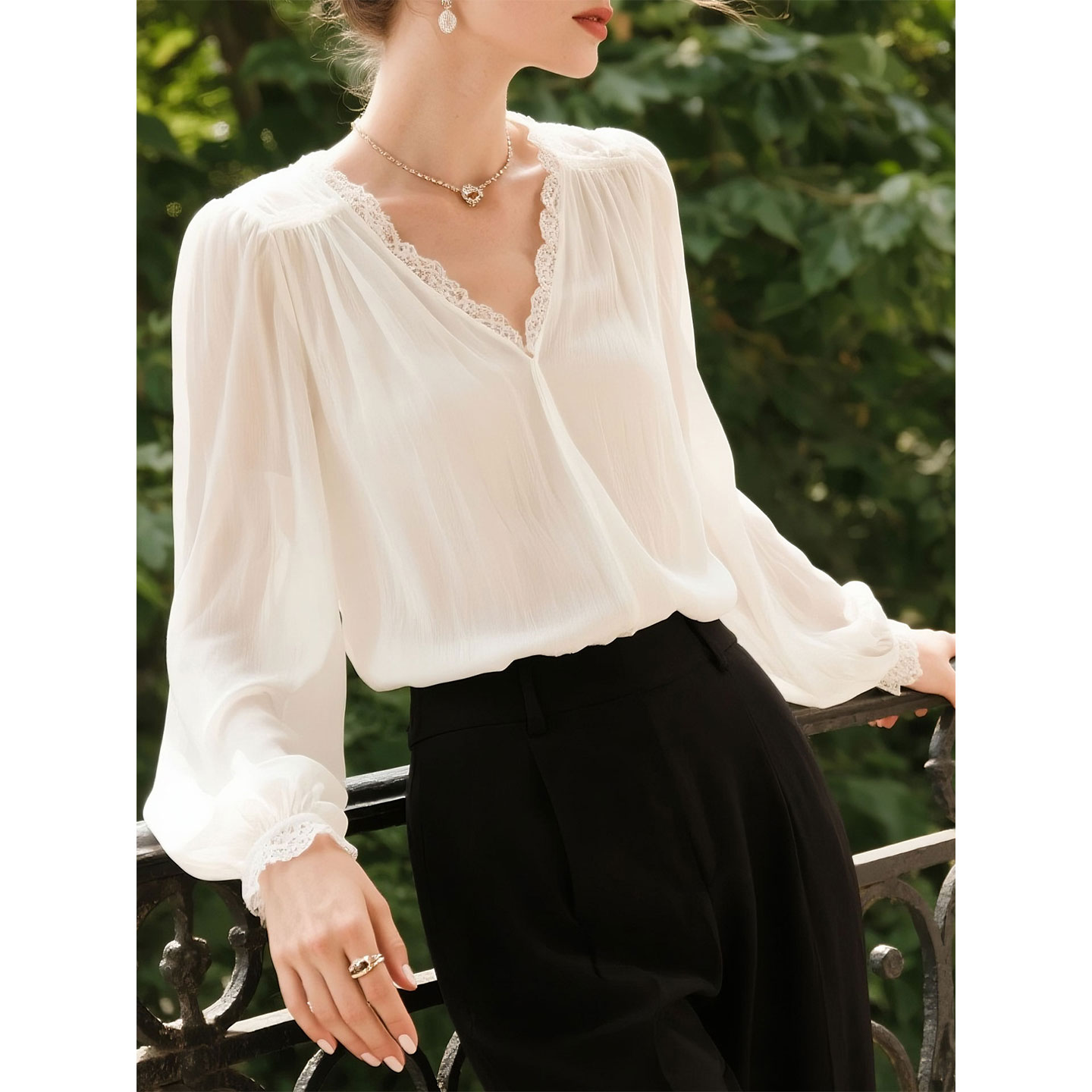 女2025秋气质蕾丝花边刺绣小衫 衬衫 上衣 重工钉珠木耳立领长袖 法式