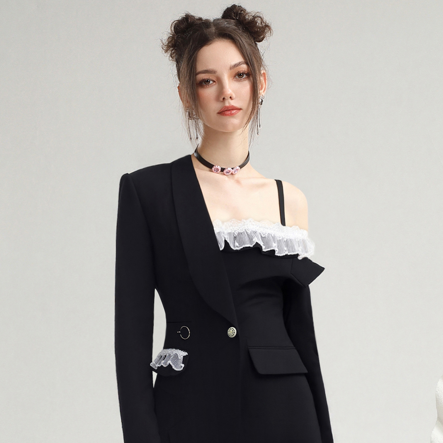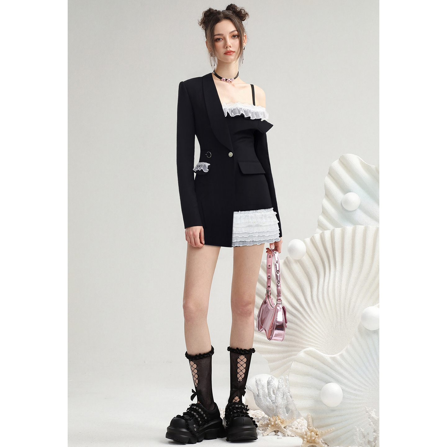 新品 连衣裙2025秋季 不规则拼接撞色设计露肩 西装 茬客甜酷少女时尚