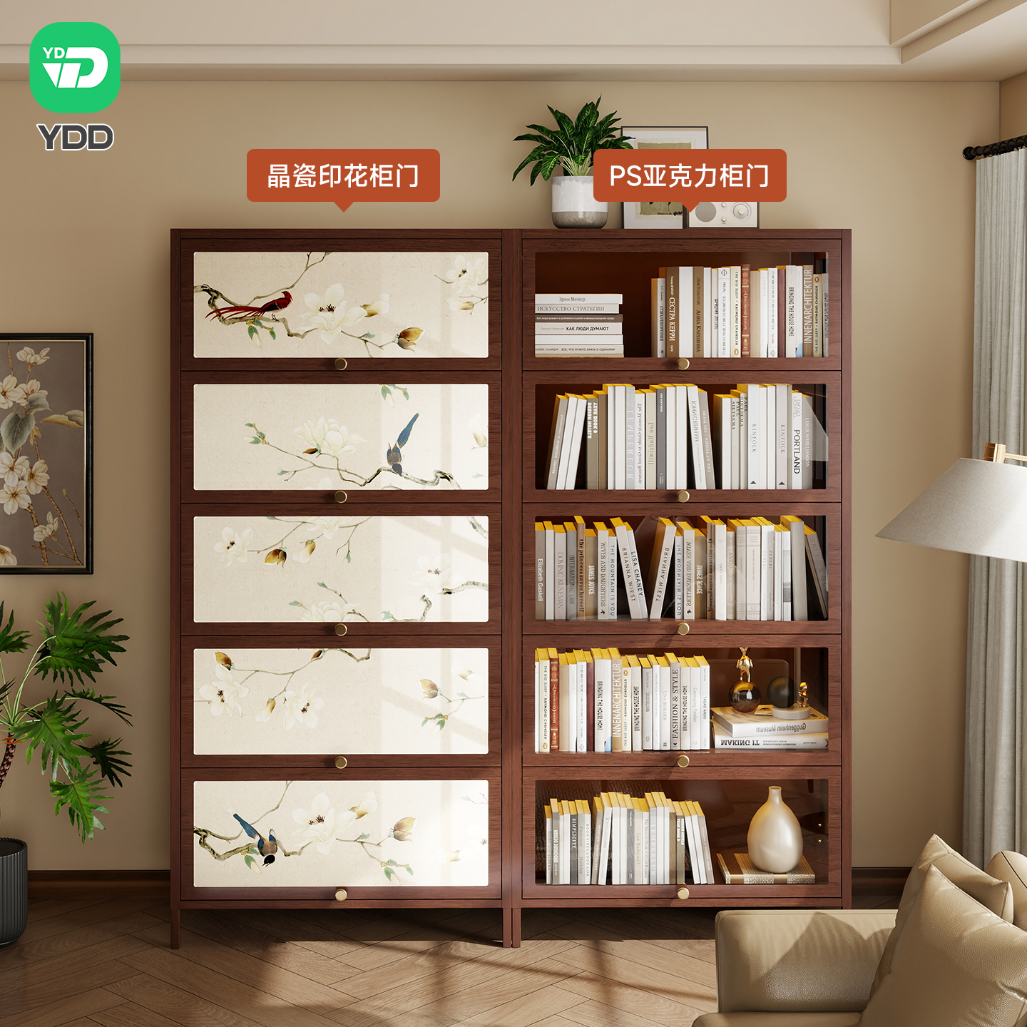 YDD伊芙 非实木书柜钢制防尘带玻璃书架置物带门客厅中古风胡桃色