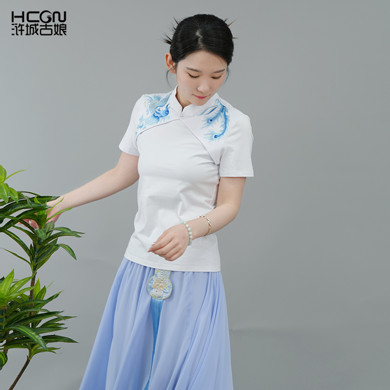 夏季 T恤 棉质舒适中国风精致刺绣气质百搭休闲减龄女显瘦立领短袖