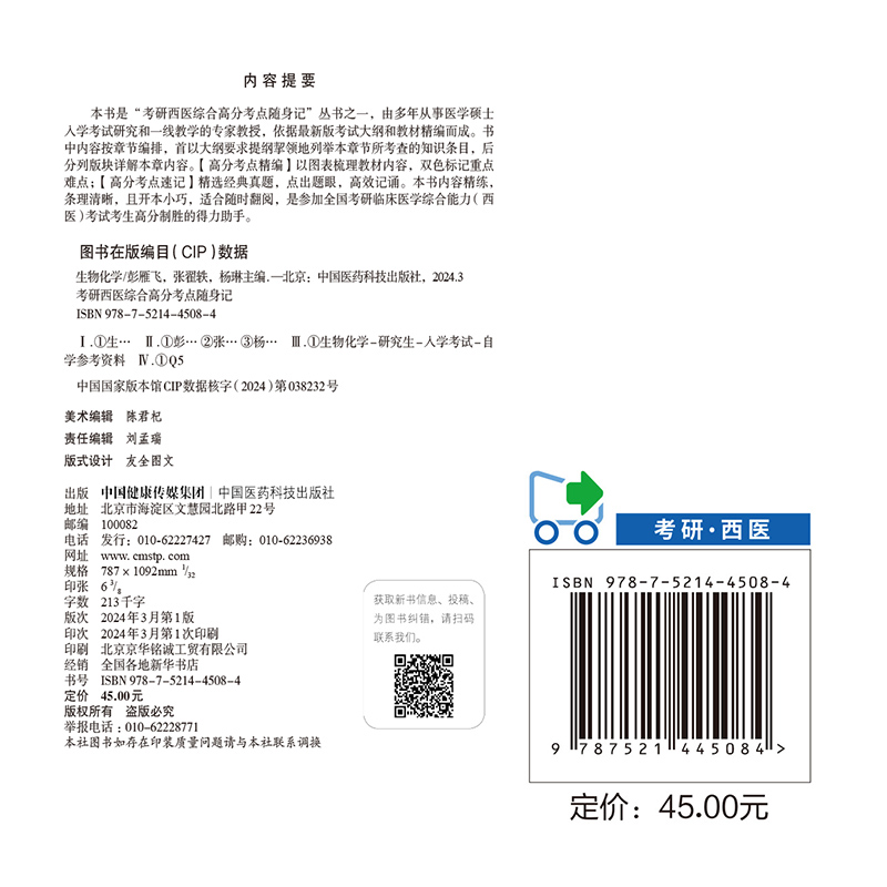彭雁飞 张翟轶 杨琳 现货正版 社 考研西医综合高分考点随身记 中国医药科技出版 9787521445084 生物化学