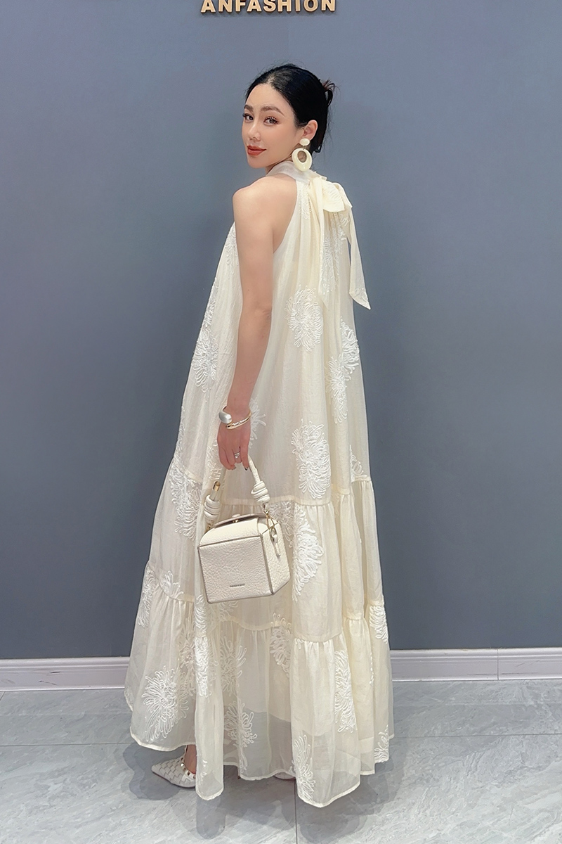 系带宽松时尚 刺绣大摆连衣裙露肩无袖 优雅淑女长裙 新款 2025秋季