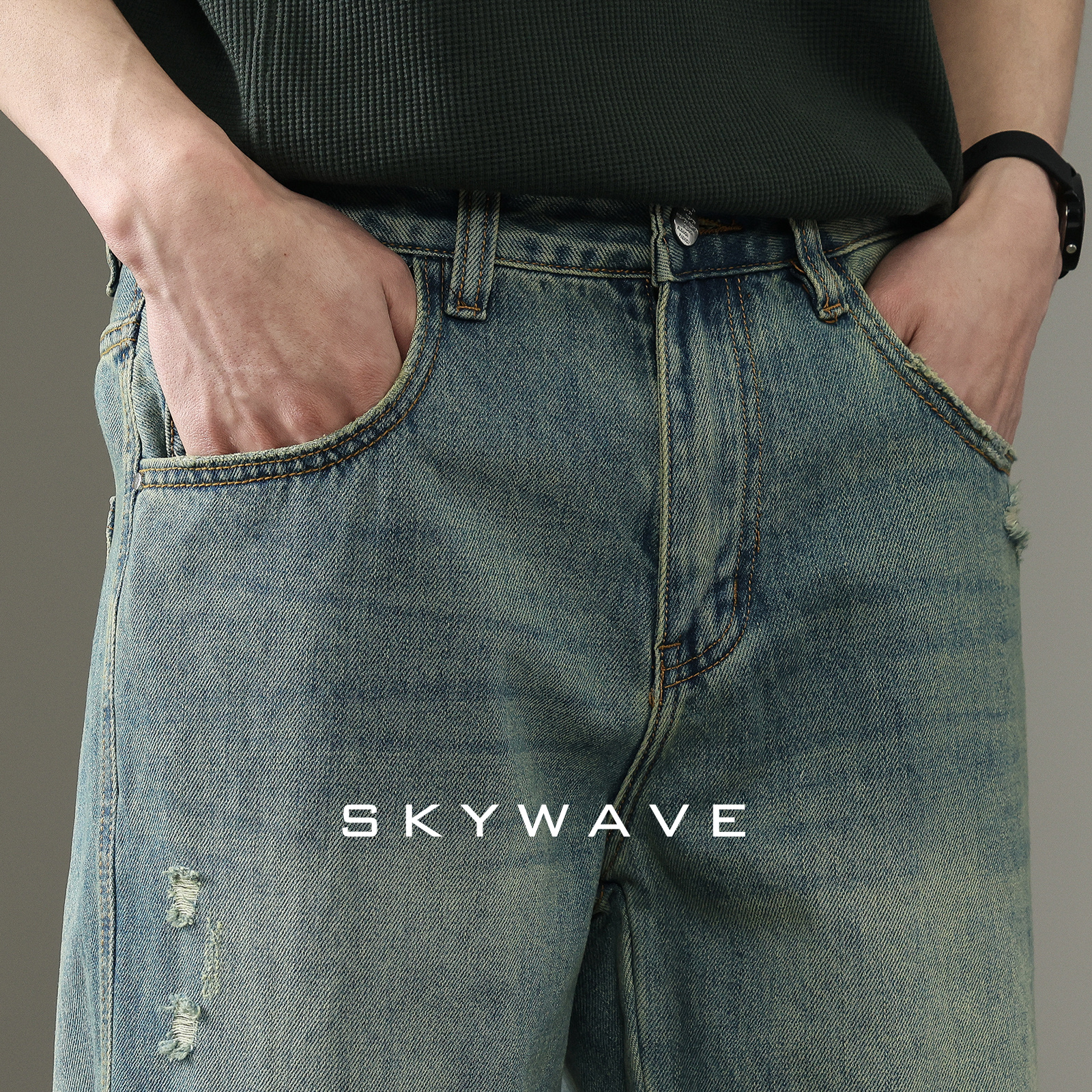 潮牌vibe宽松阔腿裤 查尔斯桃心 春秋季 男美式 渐变泼墨弯刀牛仔裤