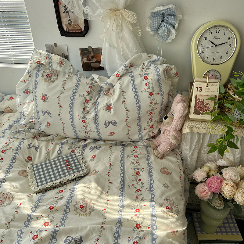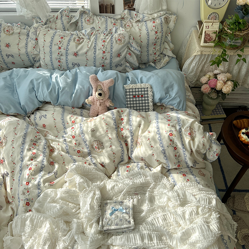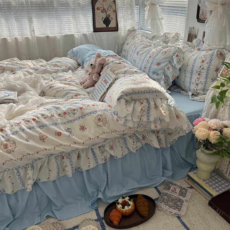 小碎花荷叶花边韩系春水洗棉四件套小红书氛围感母婴级床裙被套