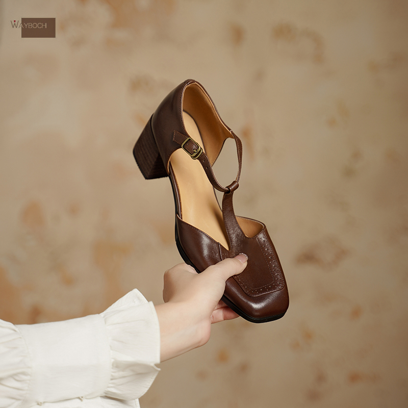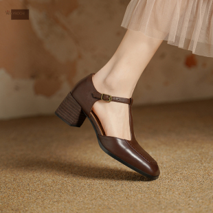 真皮复古T字带凉鞋 单鞋 女 中跟法式 粗跟方头 2025夏包头凉鞋 玮保