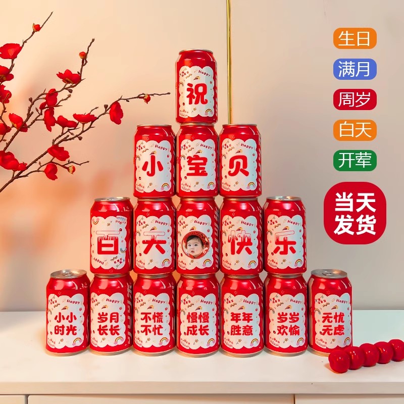 可乐贴纸定制旺仔儿童生日周岁易拉罐宝宝百天满月宴布置饮料自粘