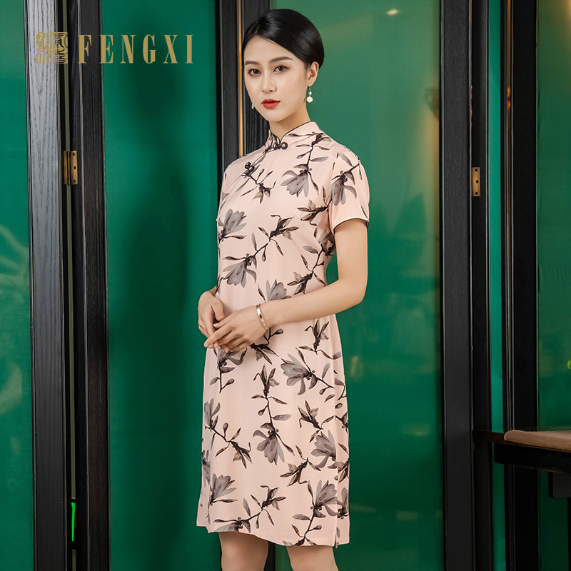 旗袍女改良年轻款 凤禧2025新款 修身 浅橘粉花朵印花短袖 连衣裙 夏季