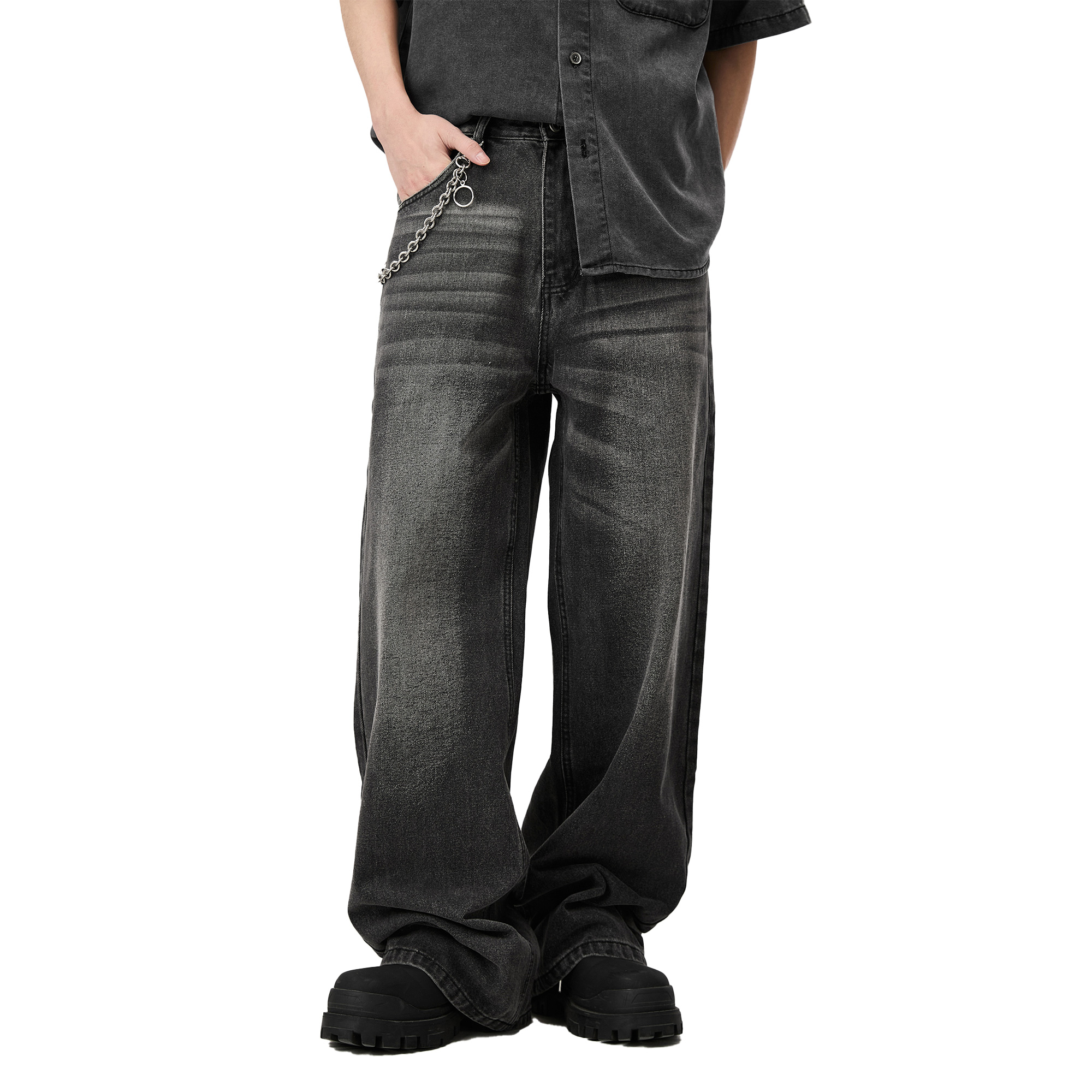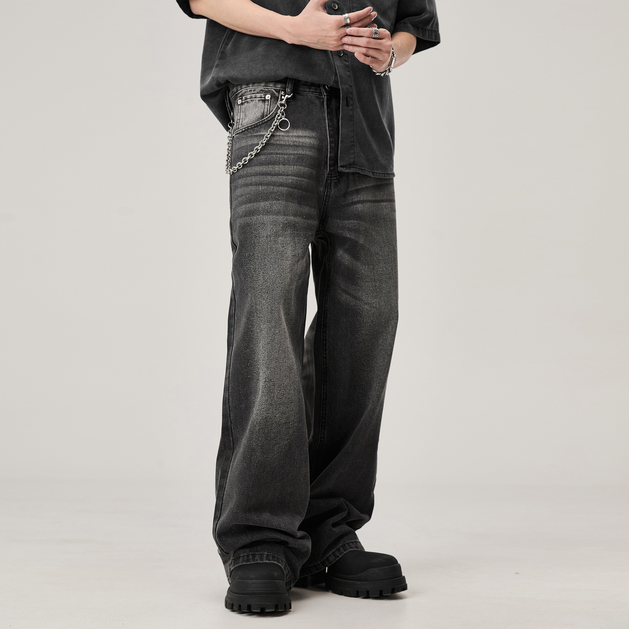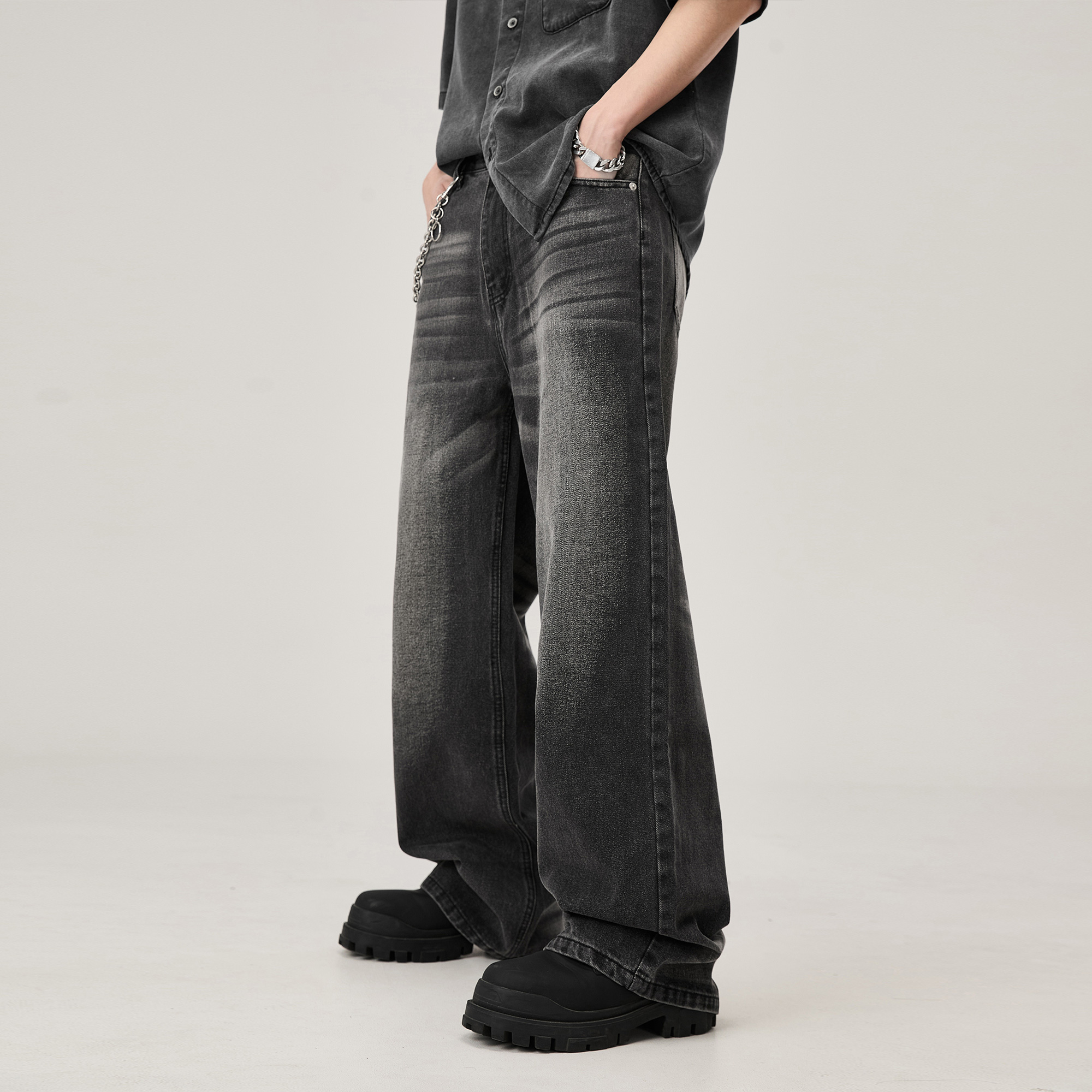 重磅复古水洗宽松直筒休闲拖地裤 秋季 男士 豪霆.微喇叭阔腿牛仔裤