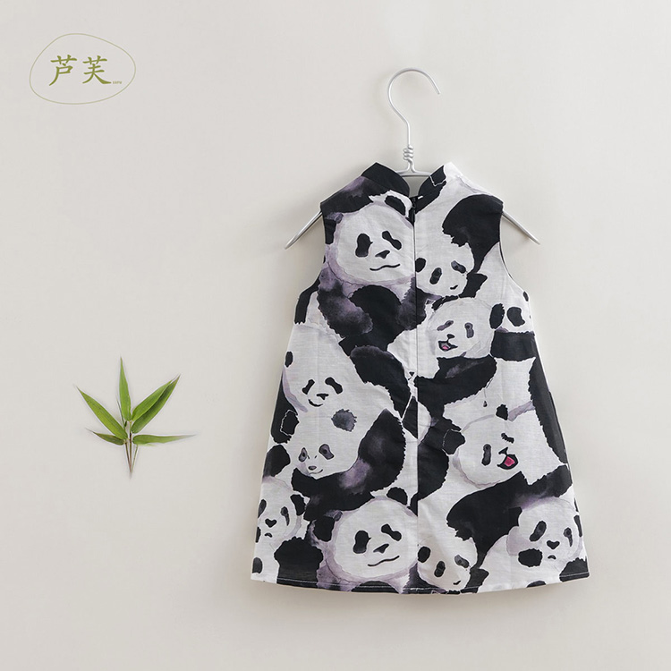 清仓 女童透气亚麻旗袍可爱熊猫无袖 新中式 新款 连衣裙 夏装