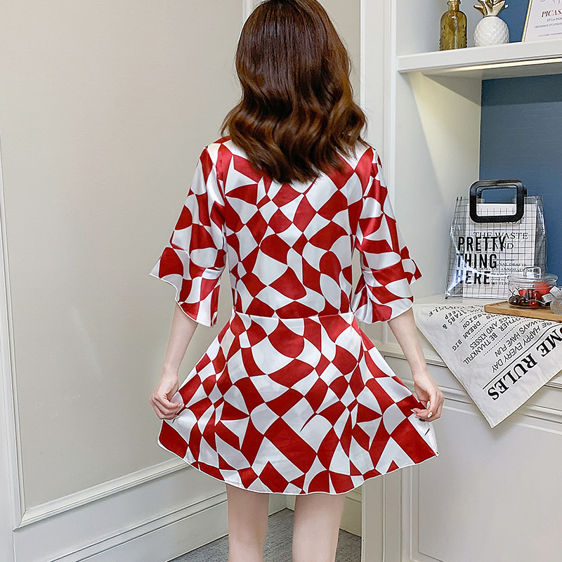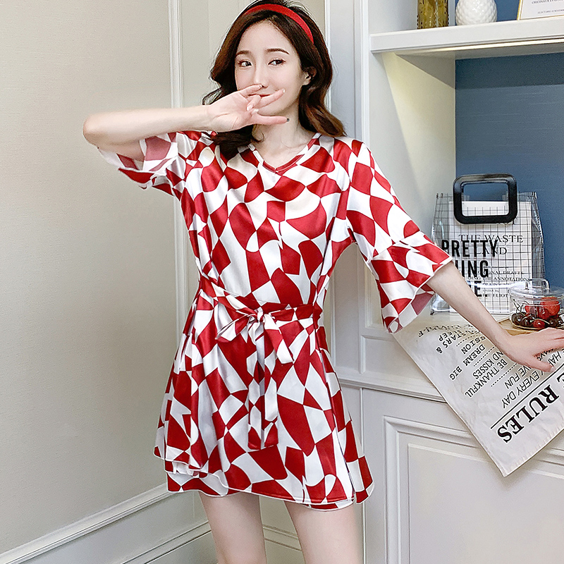 格子自带短裤 胖妹和服系绳睡衣套装 睡裙女夏季 加大码 冰丝薄款 新款