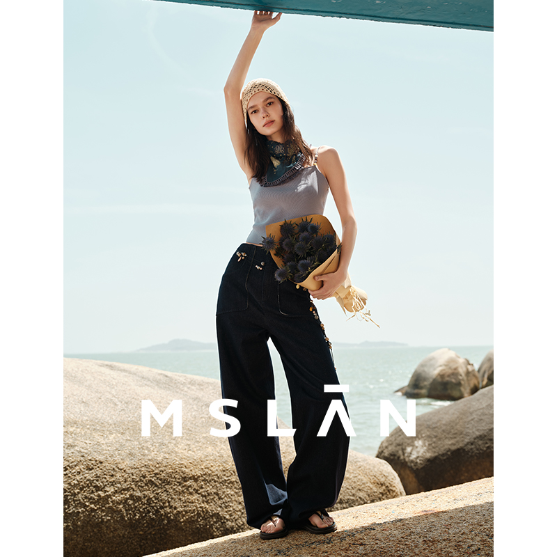 女 连腰水洗阔腿显瘦质感蓝色牛仔裤 梨型天菜 MSLAN原色牛仔弯刀裤