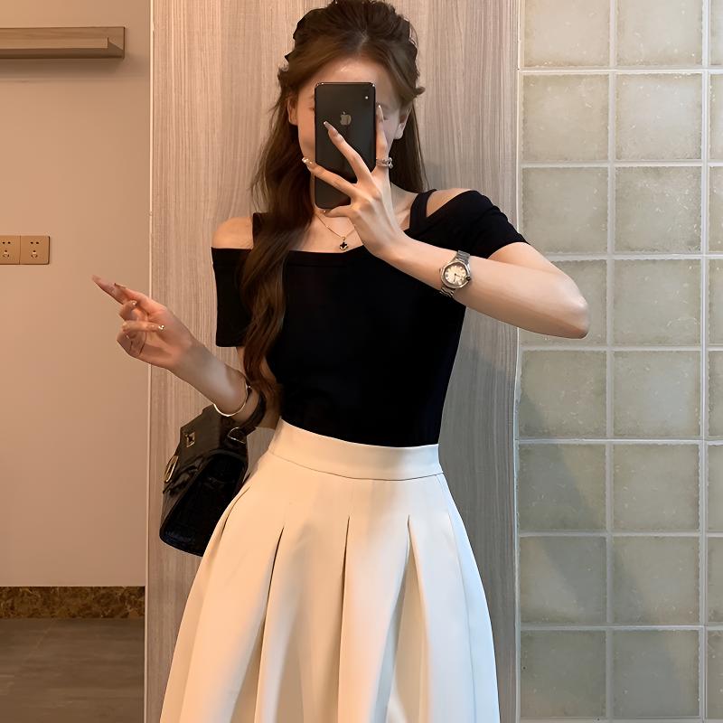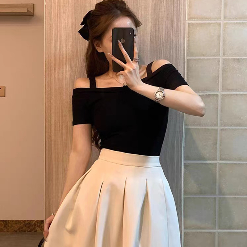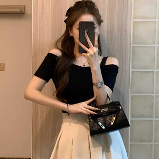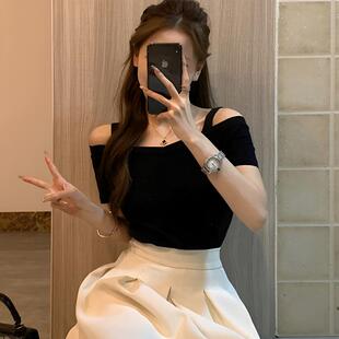 显瘦别致T恤 露肩上衣女一字肩露锁骨设计感小众修身 夏季 黑色短袖