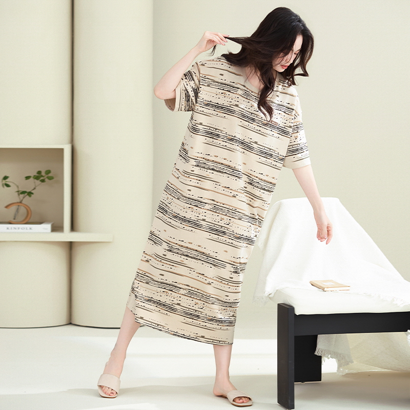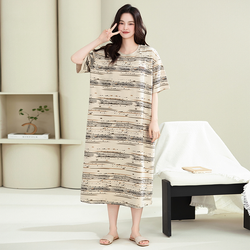 简约风连衣裙 睡衣裙女夏天圆领宽松大码 宜而爽纯棉睡裙短袖 中长款