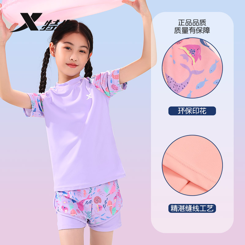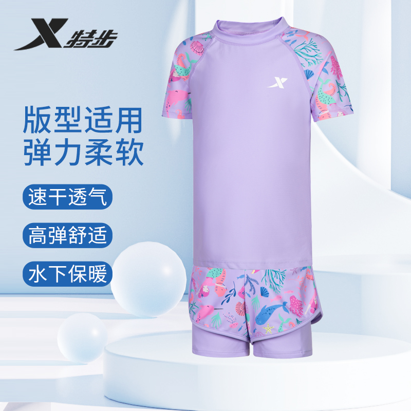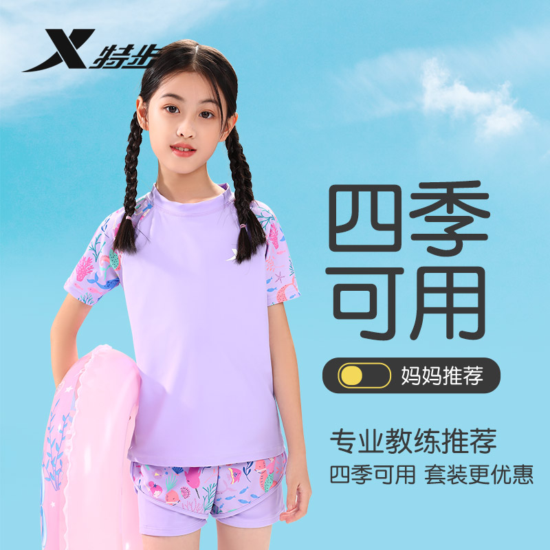 特步儿童泳衣女童2025新款 分体平角防晒速干中大童专业游泳衣女孩