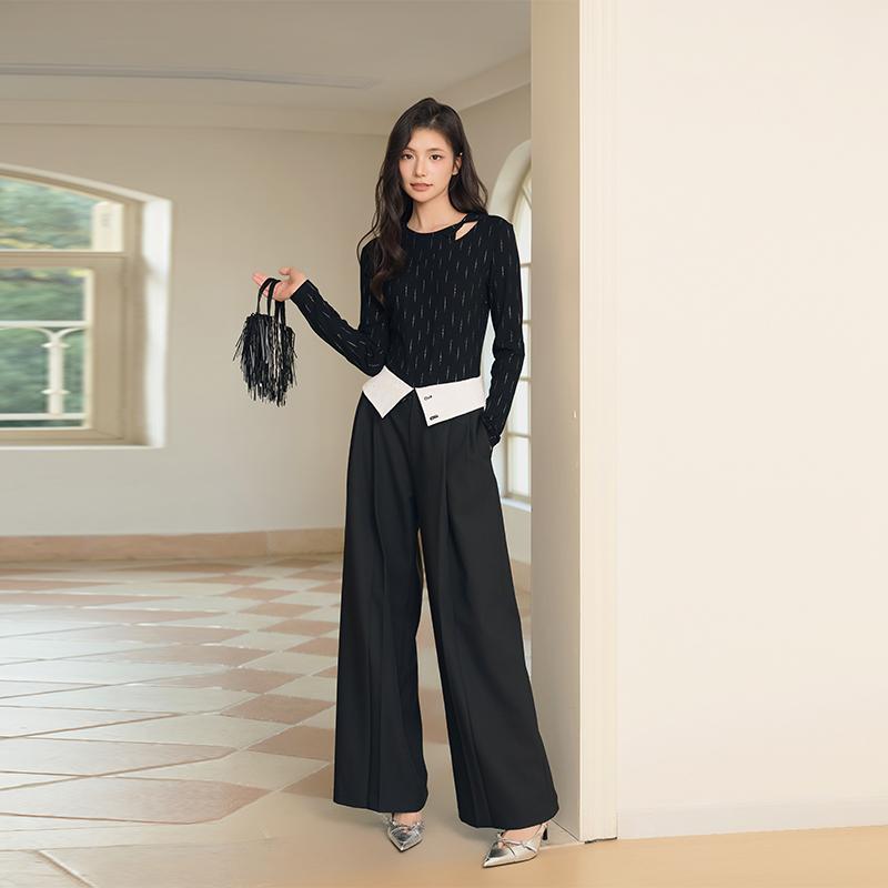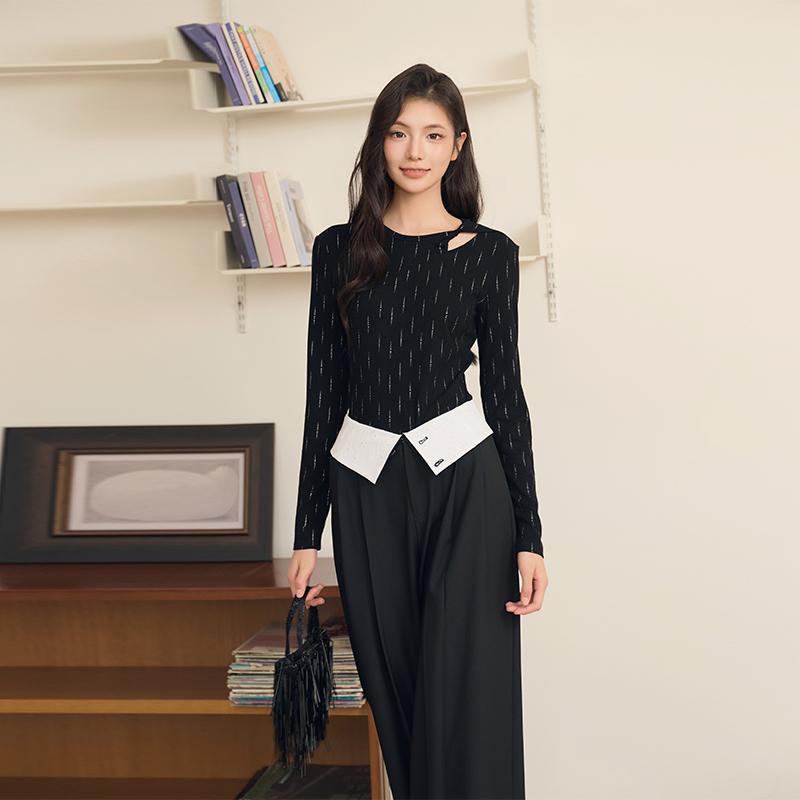T恤银泰百货精品301355 女士黑色烫银纽结镂空长袖 Three Quarters