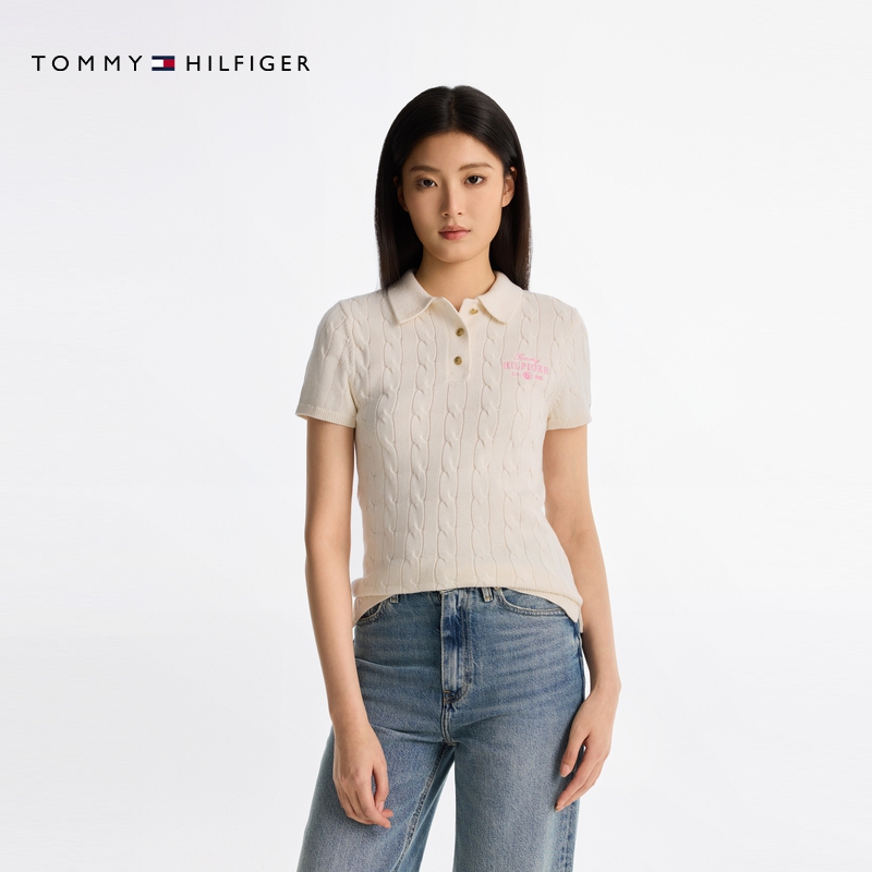 亚洲版 纯棉通勤修身 薄款 麻花纯色短袖 Tommy25春夏新款 针织衫 女装