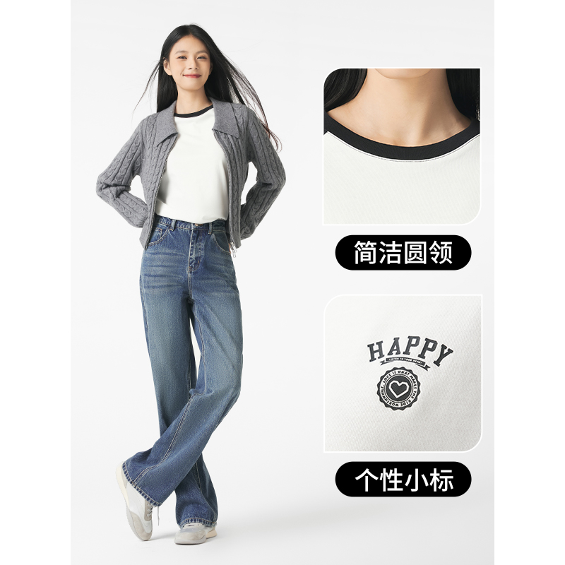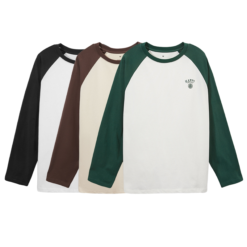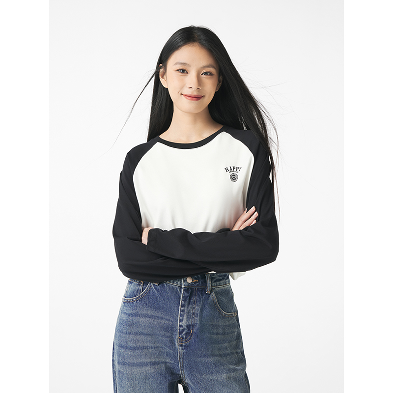 长T恤百搭圆领长袖 女士简约印花撞色插肩袖 新款 热风2025年秋季