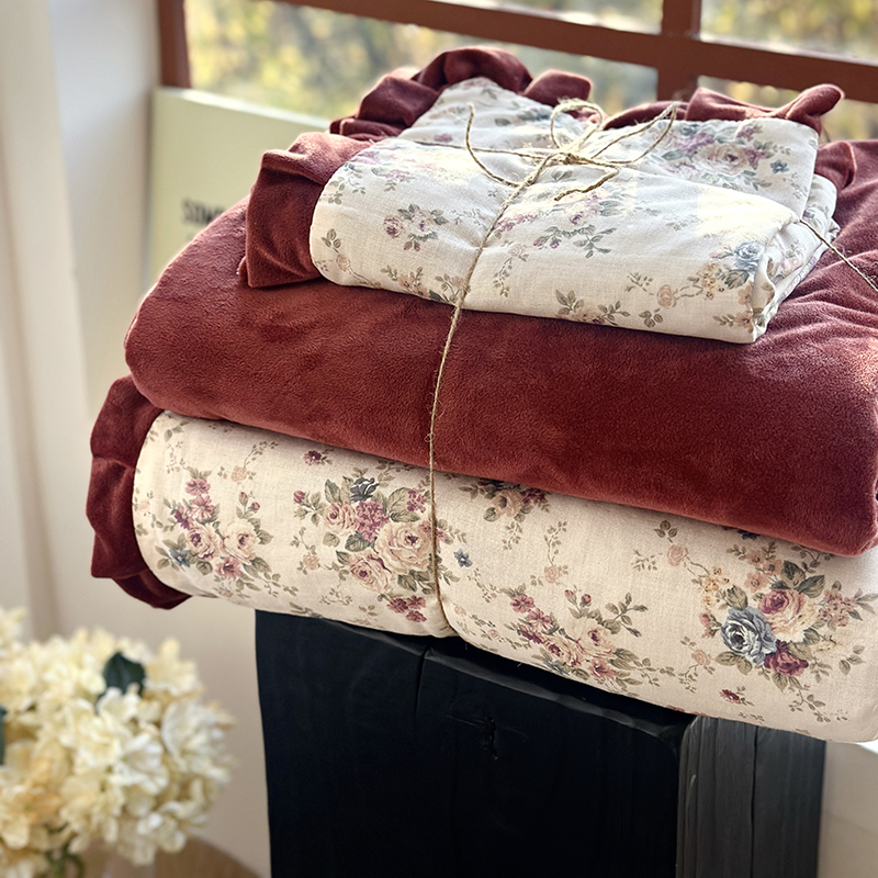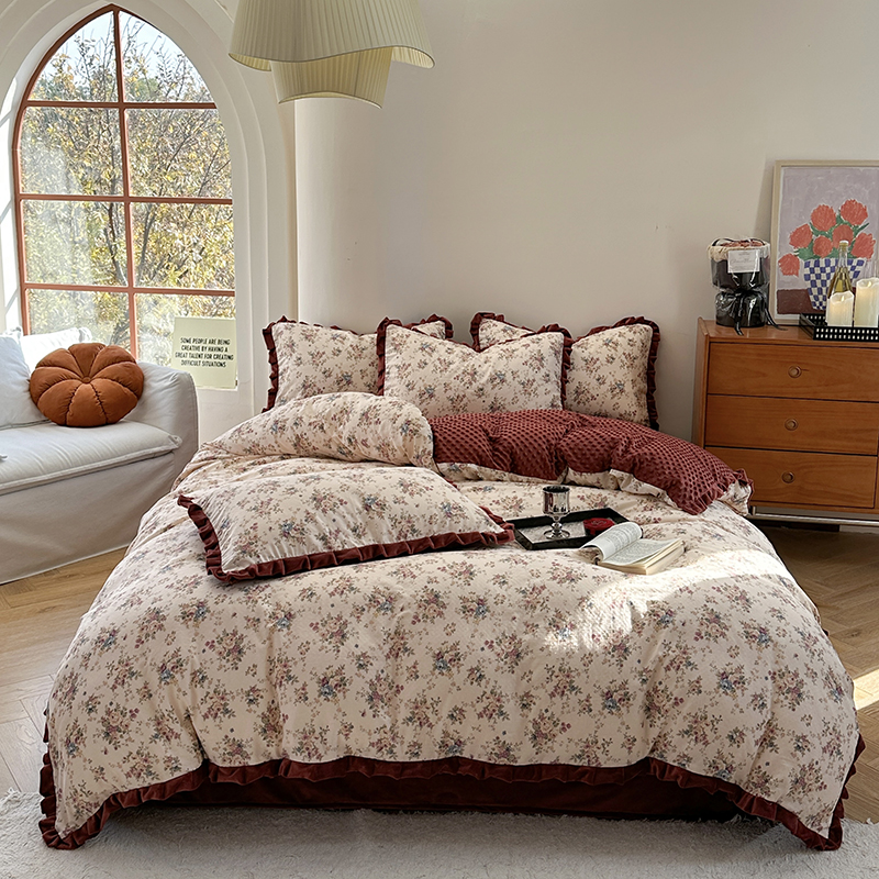 田园美式 花边红色碎花全棉豆豆绒四件套双层纱纯棉被套床单三件套