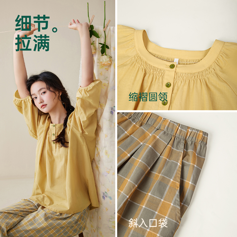 纯棉休闲格子套装 安之伴 春秋季 睡衣女款 家居服可外穿 梭织棉布