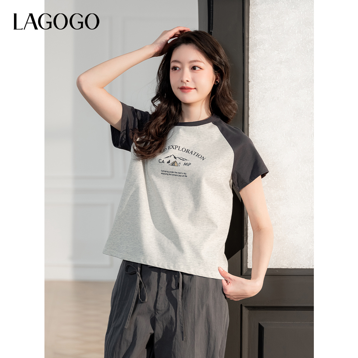 LAGOGO纯棉撞色设计感T恤女拉谷谷2025春夏新款 运动户外穿搭短袖