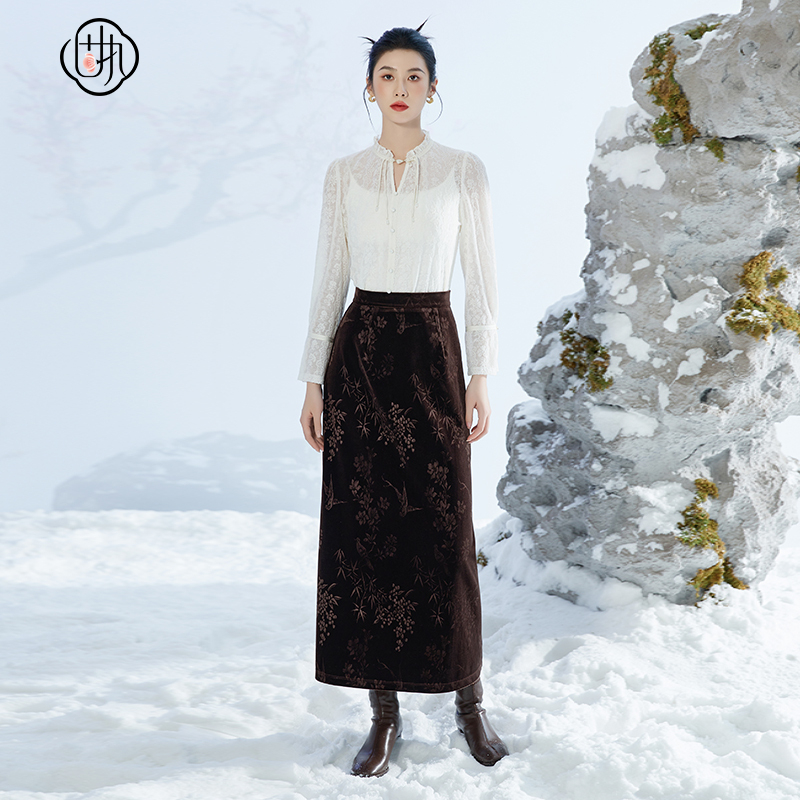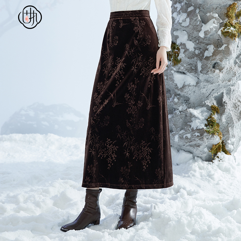 显瘦绒感中长裙子 休闲高腰修身 紫涵复古咖格直筒半身裙女冬季 新款