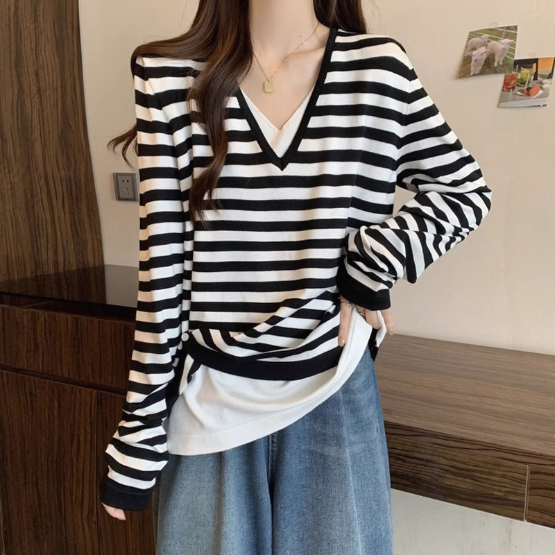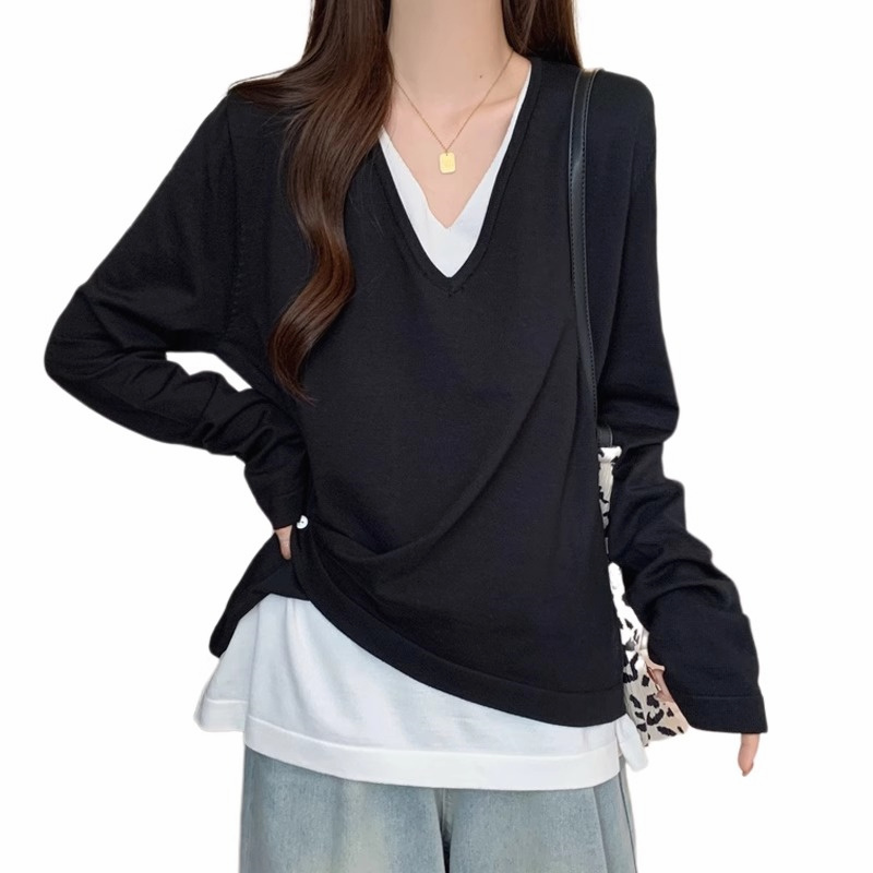 女2025春秋季 胖M宽松遮肚内搭打底衫 新款 假两件V领长袖 大码 针织衫