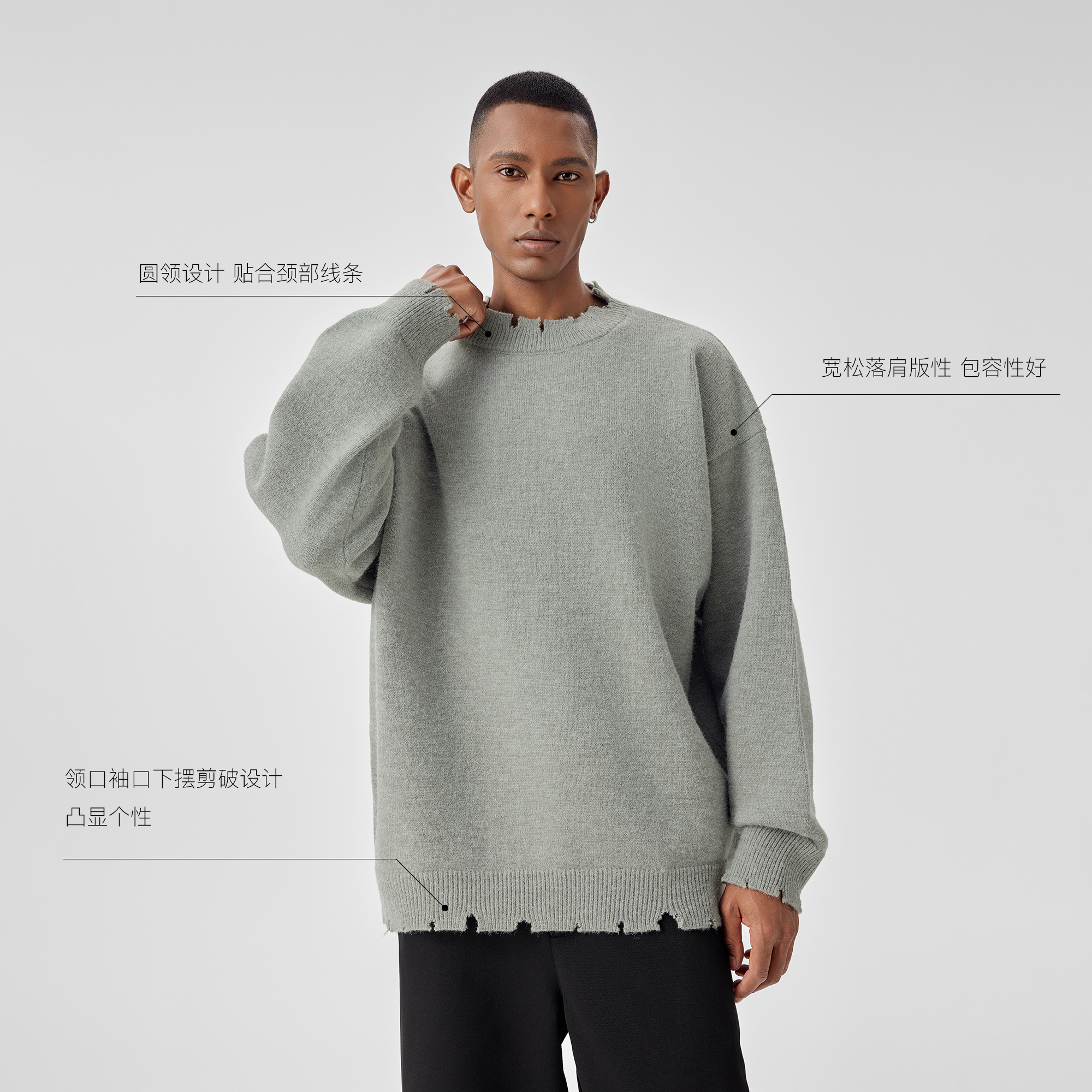 BODYDREAM 宽松复古纯色毛线衣潮 BM圆领毛衣男休闲破洞套头针织衫
