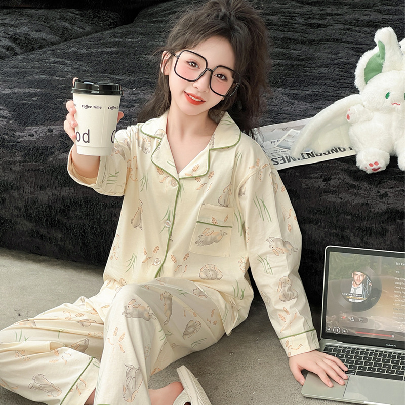 带胸垫防凸点全棉家居服套装 秋冬款 长袖 纯棉秋季 睡衣女士2025新款