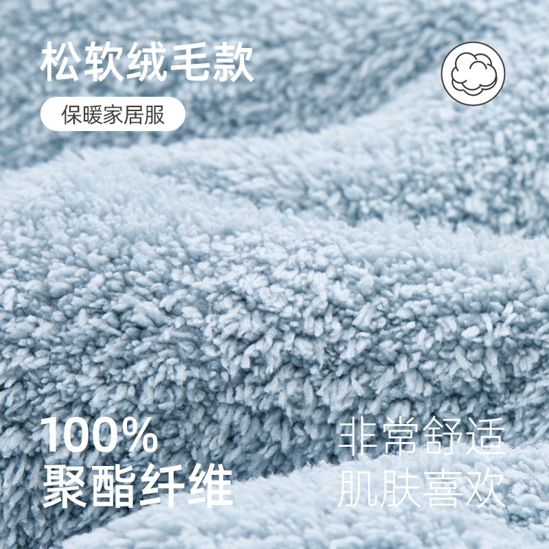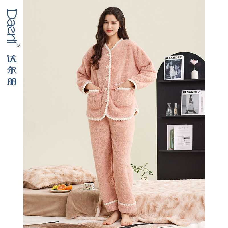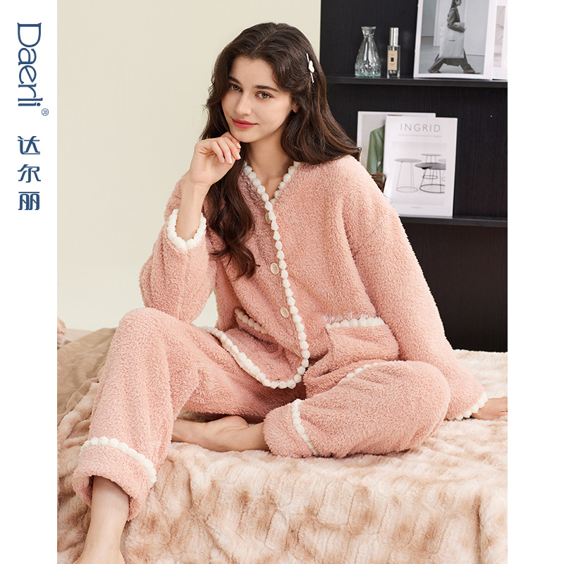 女士家居服套装 保暖V领开衫 厚 加绒长袖 达尔丽暖暖绒睡衣女秋冬季