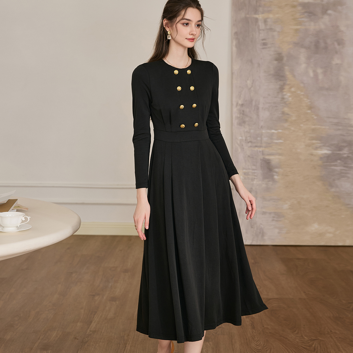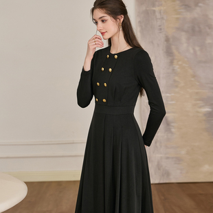 罗衣优雅大摆黑色针织连衣裙2025秋季 气质显瘦褶皱裙子09932 新款