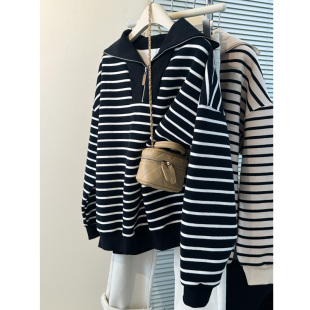 宽松休闲半拉链上衣 韩版 bf慵懒风条纹Polo翻领长袖 卫衣女春秋薄款