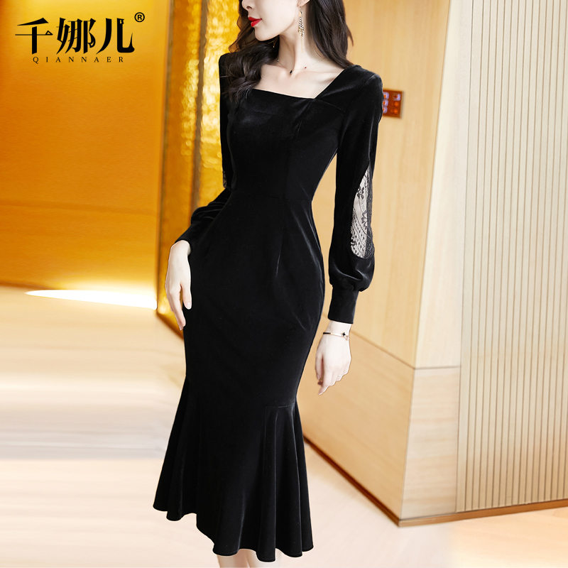 赫本风挂脖长袖 高级感气质露肩收腰黑色a字千金裙 连衣裙女早秋季