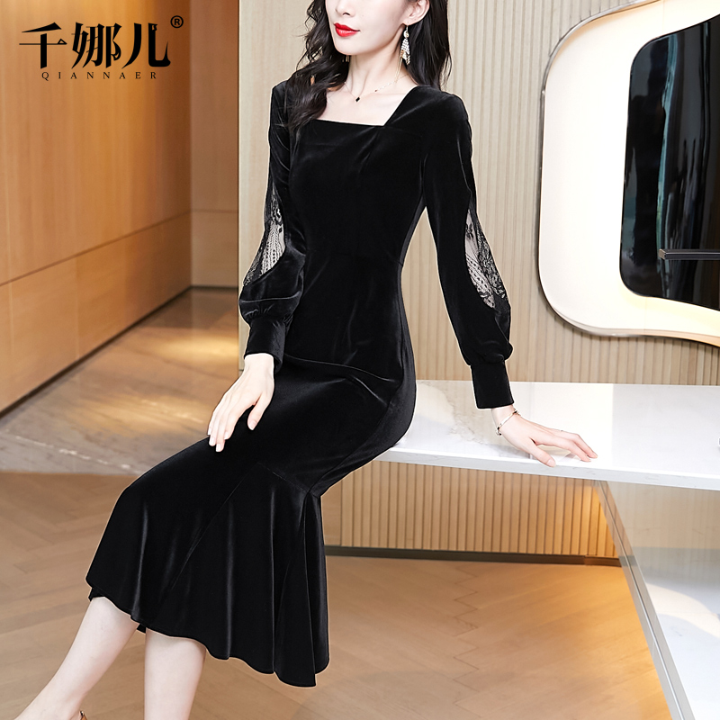 黑圆领长袖 经典 金银丝针织连衣裙长裙 portrait self
