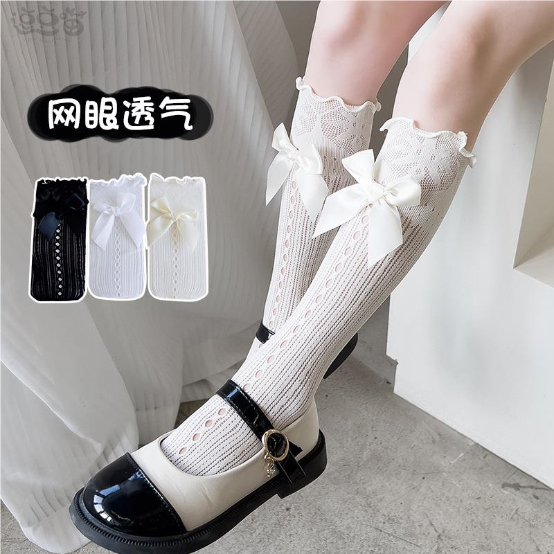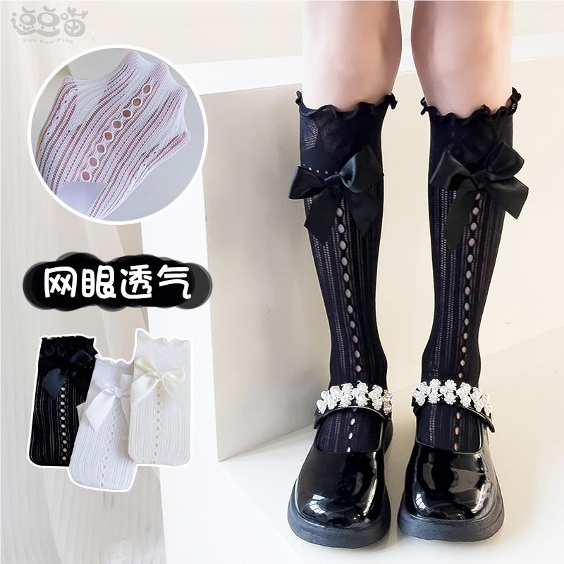 女童袜子洛丽塔春夏季 儿童蝴蝶结蕾丝长筒宝宝公主花边中筒袜 薄款