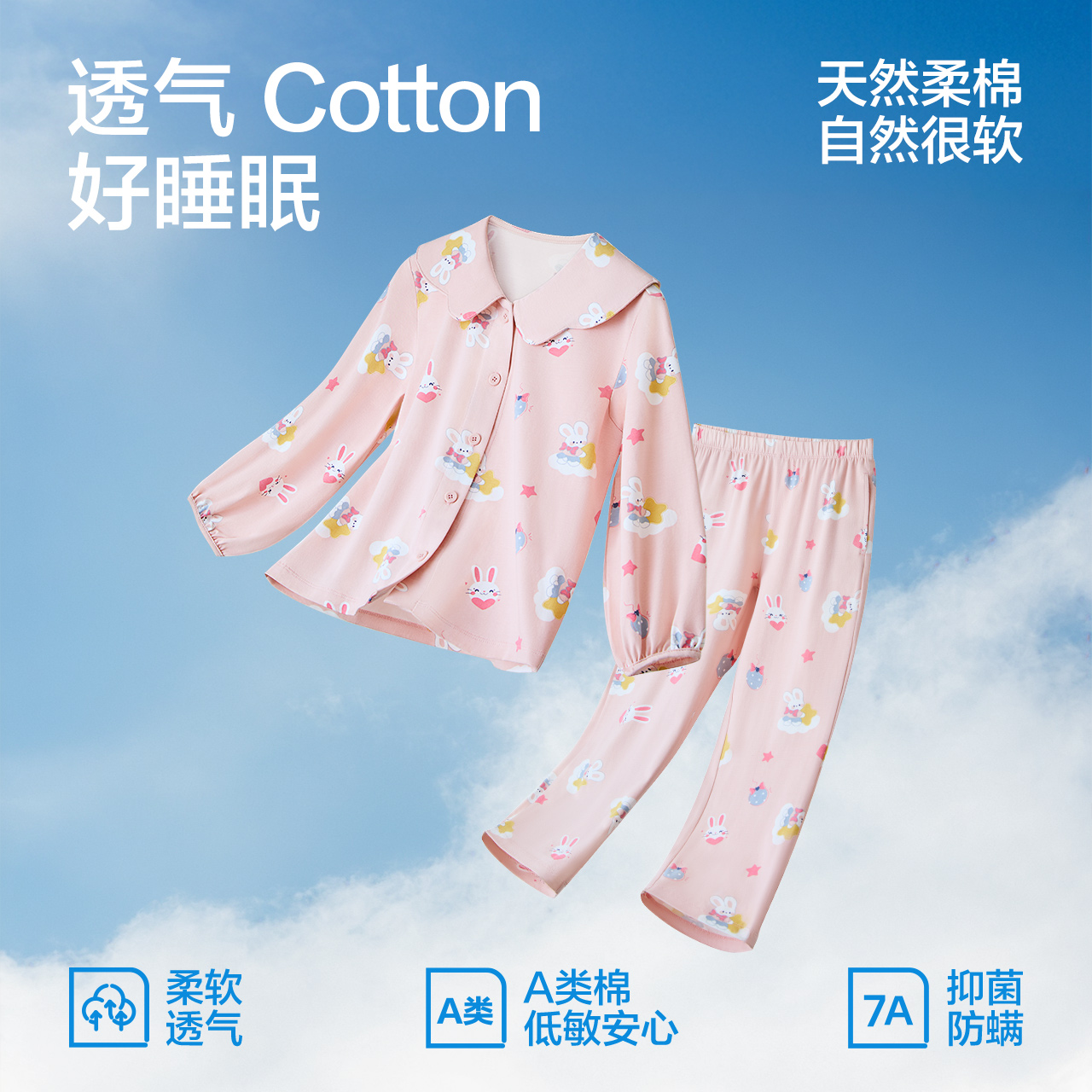 红豆儿童长袖 翻领可爱印花A类柔软棉抑菌2025春夏中大童 睡衣套装